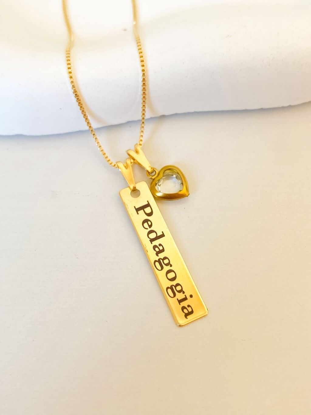 Nosso colar personalizado é banhado a ouro 18k, com pingente de 3cm e corrente de 40cm. Você pode escolher gravar com nome, profissão, iniciais, datas especiais, frases ou qualquer texto que desejar.